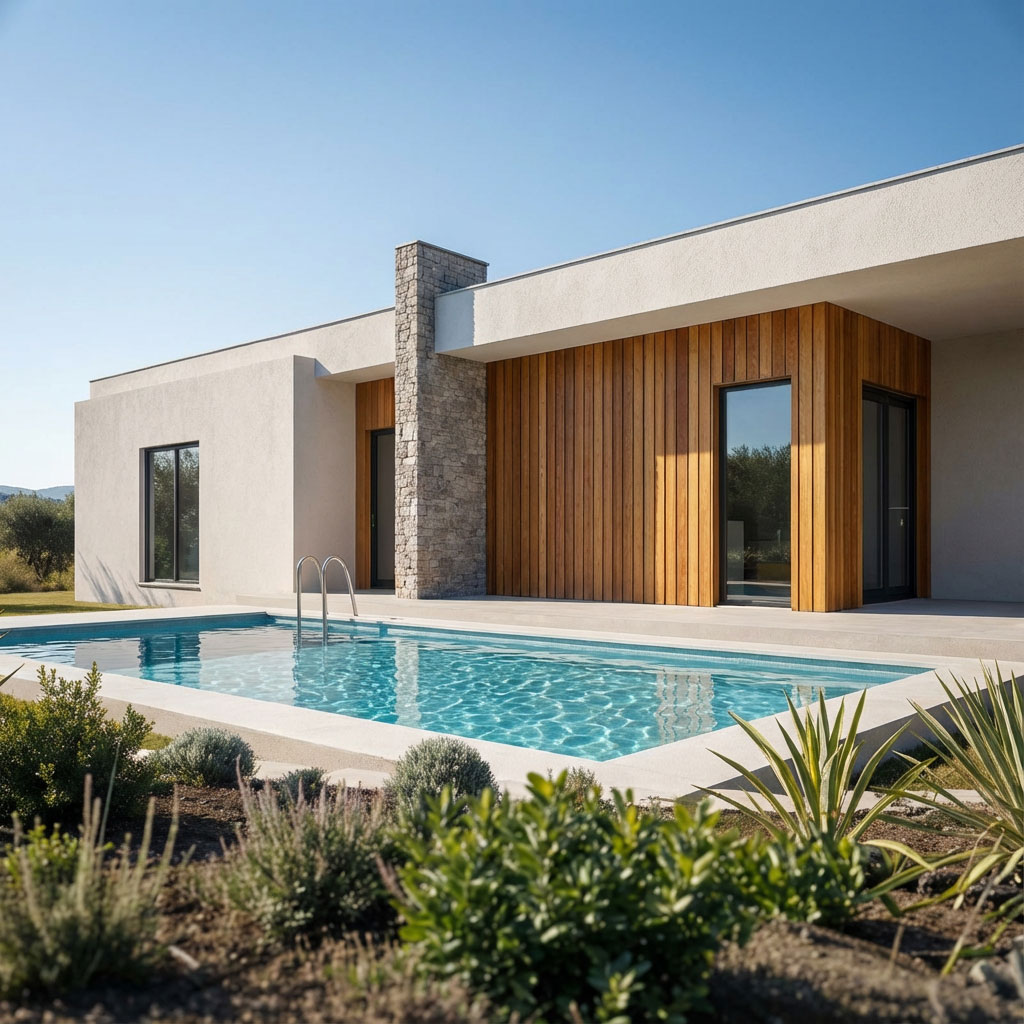 Moderný bungalov s plochou strechou zaujme aj náročnejších klientov. Fasáda vyniká harmonickým dizajnom ktorý spája svetlú farbu s dreveným obkladom a výrazným kamenným komínom.