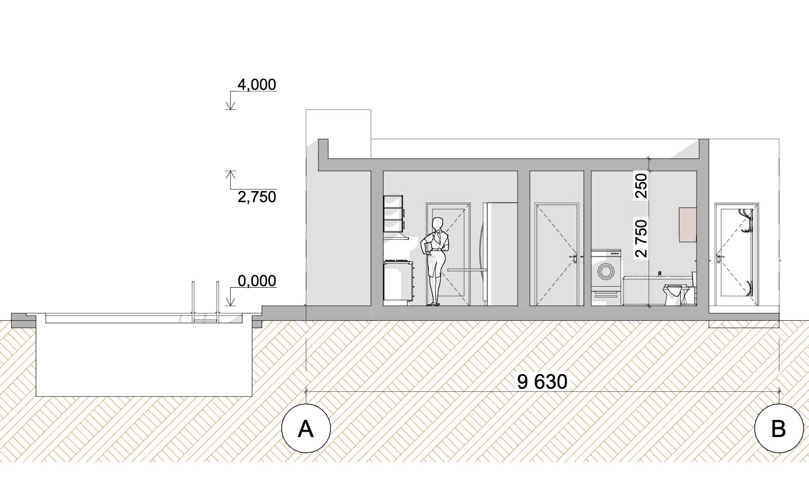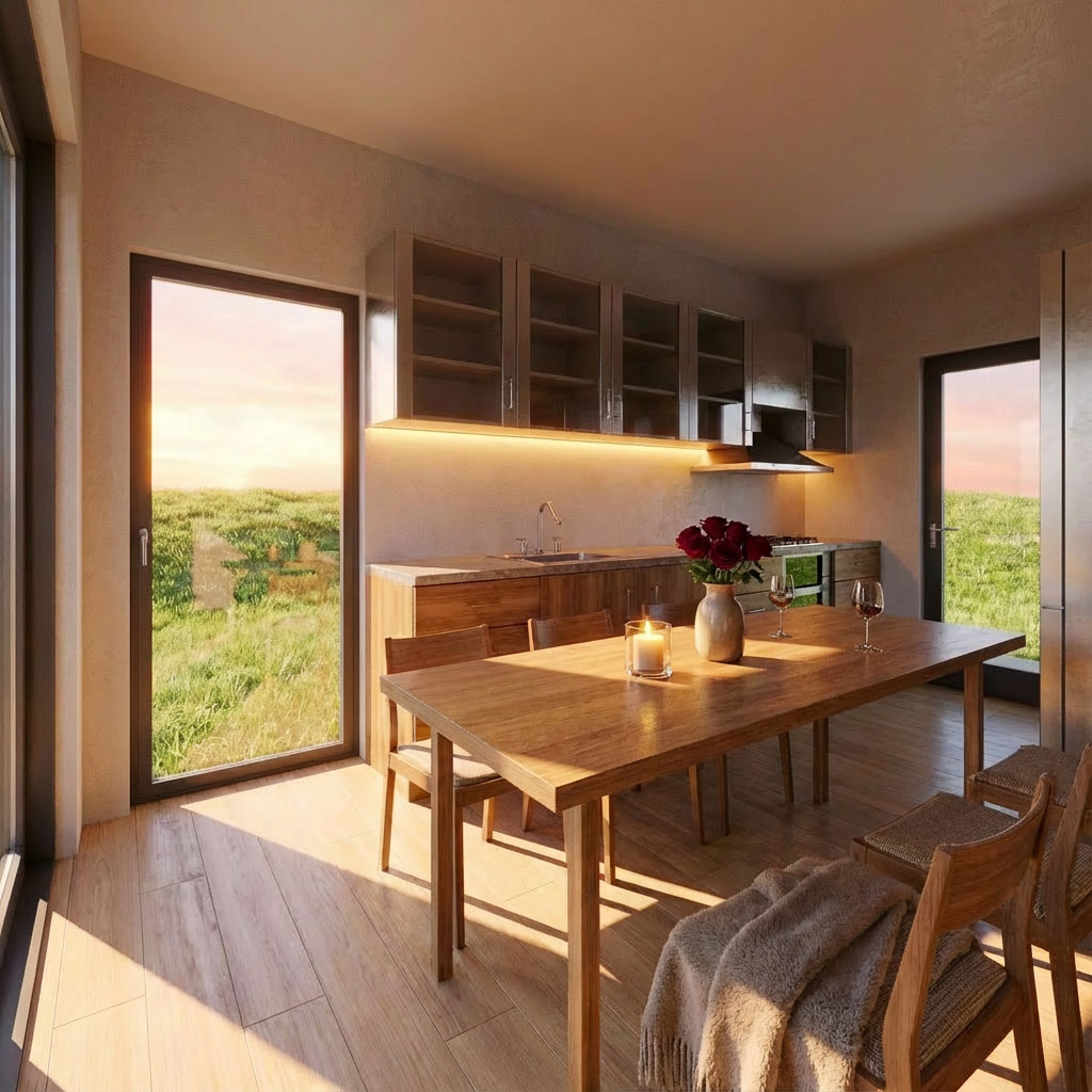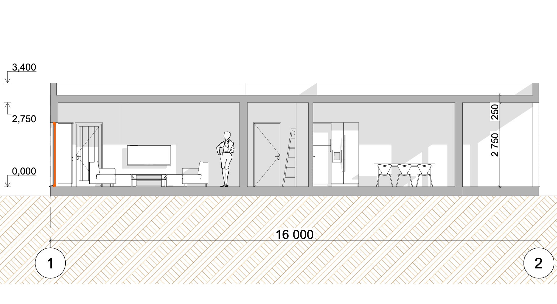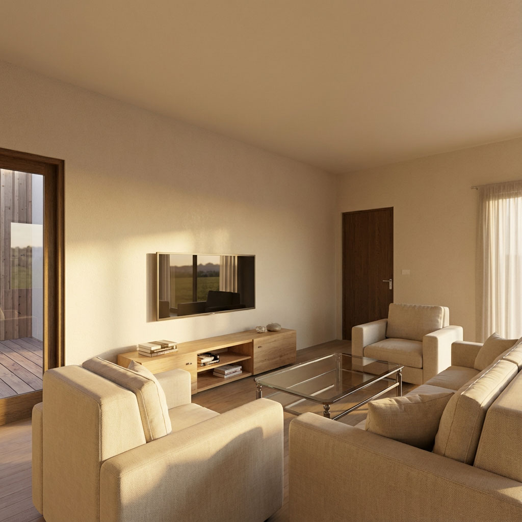 Svetlá fasáda s teplým odtieňom vertikálneho dreveného obkladu dodáva objektu luxusný vzhľad, ktorý vkusne dotvára dominantný komín z opracovaného prírodného kameňa. Interiér je rozdelený na centrálnu časť, pričom po oboch stranách tohto spoločenského jadra sú situované samostatné izby.