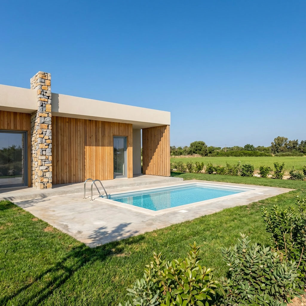 Vonkajší vzhľad domu spája svetlú fasádu s vertikálnym dreveným obkladom a dominantným komínom z prírodného kameňa, ktorý vytvára prirodzený kontrast k hladkým plochám a drevu. Celkový vzhľad dopĺňa priestranná terasa s možnosťou osadenia bazénom. Vnútorný priestor efektne rozdeľuje obývaciu časť a kuchyňu od dvoch spální umiestnených na okrajoch dispozície. Interiér presvetľujú veľké okná, celkové riešenie pôsobí nadštandardne, dizajnovo a prakticky.